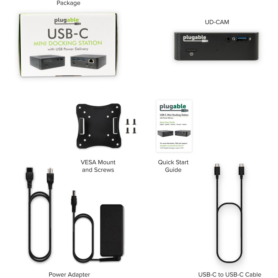 UD-CAM Mini Docking Station,1m long USB-C cable, 100W (20V, 5A) power supply with US power plug, VESA Mount, and quick start guide.