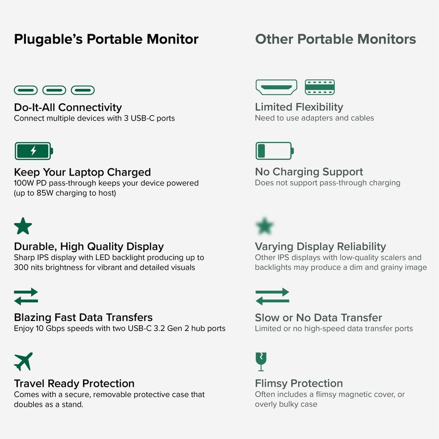 - Why Choose this Award-Winning Monitor – The Plugable USB-C portable monitor for laptop (USBC-PDMON) offers premium features like 2x 10Gbps USB-C ports for data or connecting peripherals, 100W PD pass-through (85W charging), crisp 15.6″ IPS display, cover/stand. It’s no wonder this monitor was named Editor’s Choice by ZDNET, Laptop Mag, MacWorld, and Engadget