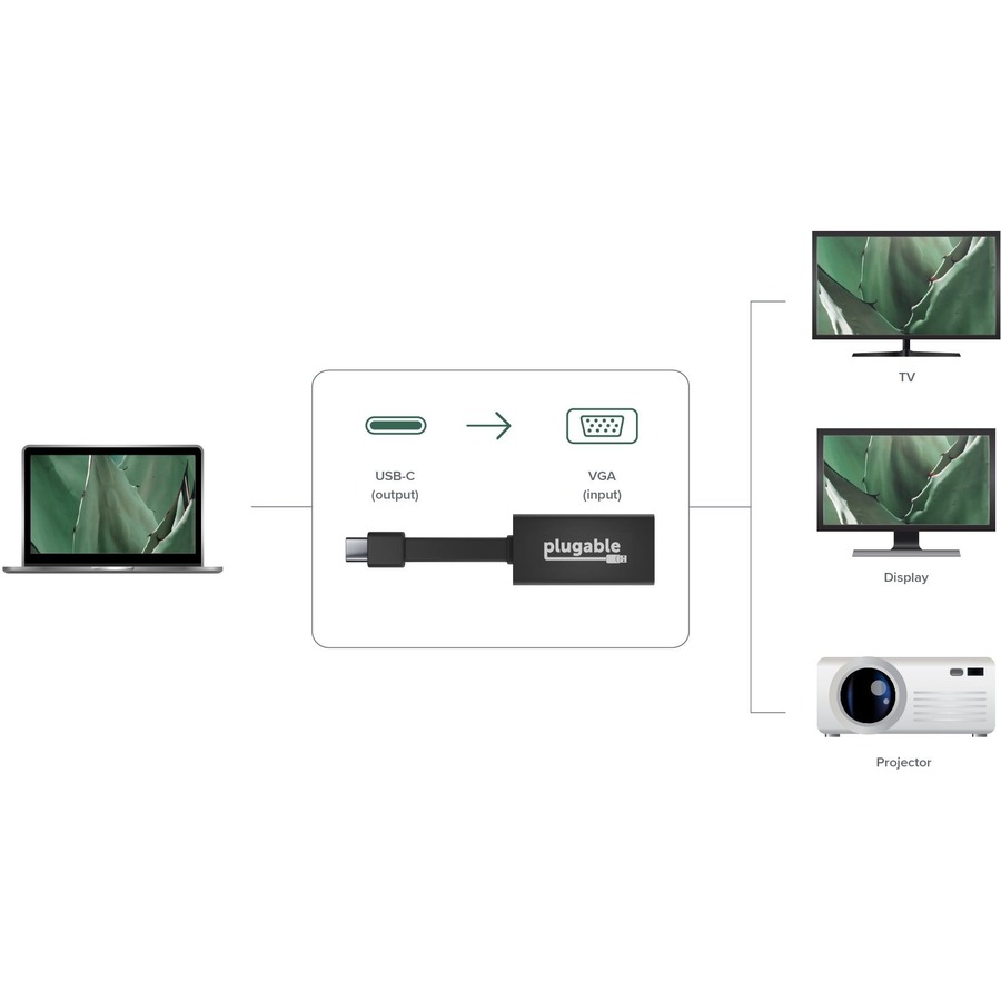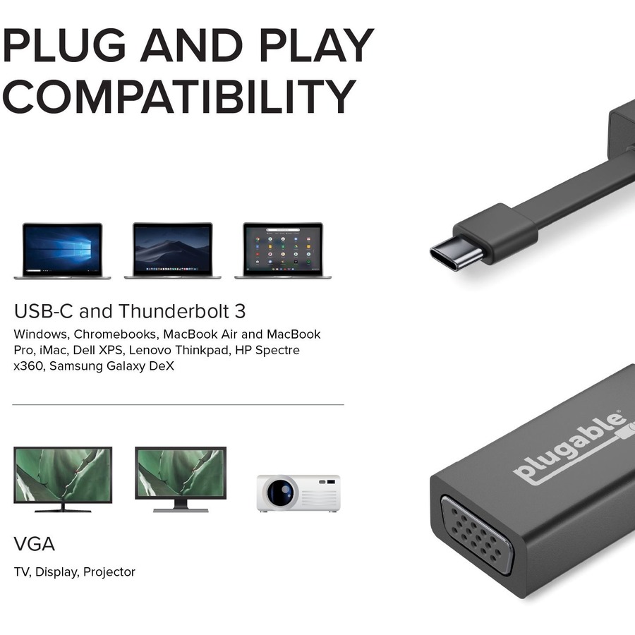 The Plugable USB-C to VGA Adapter (USBC-TVGA) is for users who want to add a VGA connected monitor, projector, or TV to their USB-C or Thunderbolt 3 compatible computer.