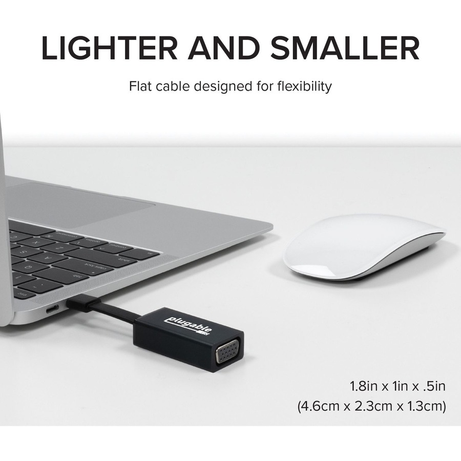 This compact adapter is under 2 inches in size, making it perfect for travel and taking on the go. Featuring a unique flat cable design, you can forget about messy cables and take advantage of the tight bend radius, which allows the adapter to fit in confined and compact spaces. The adapter enables a VGA output at resolutions up to 1920×1200 @ 60Hz from systems which support “DisplayPort Alternate Mode” (Alt Mode) via USB-C.