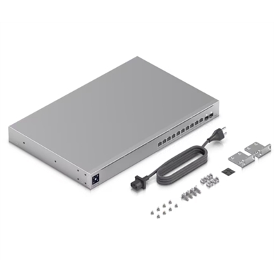 1U, professional-grade 10-port, Layer 3 Etherlighting PoE+++ switch with (10) 10 GbE and (2) 10G SFP+ ports. Etherlighting ports that illuminate to indicate port location, speed/link, and native VLAN/network (10) 10 GbE PoE+++ ports (2) 10G SFP+ ports DC power backup ready 400W total PoE availability Pair with UniFi Enterprise Patch Cable for optimal brightness. Requires UniFi RPS.