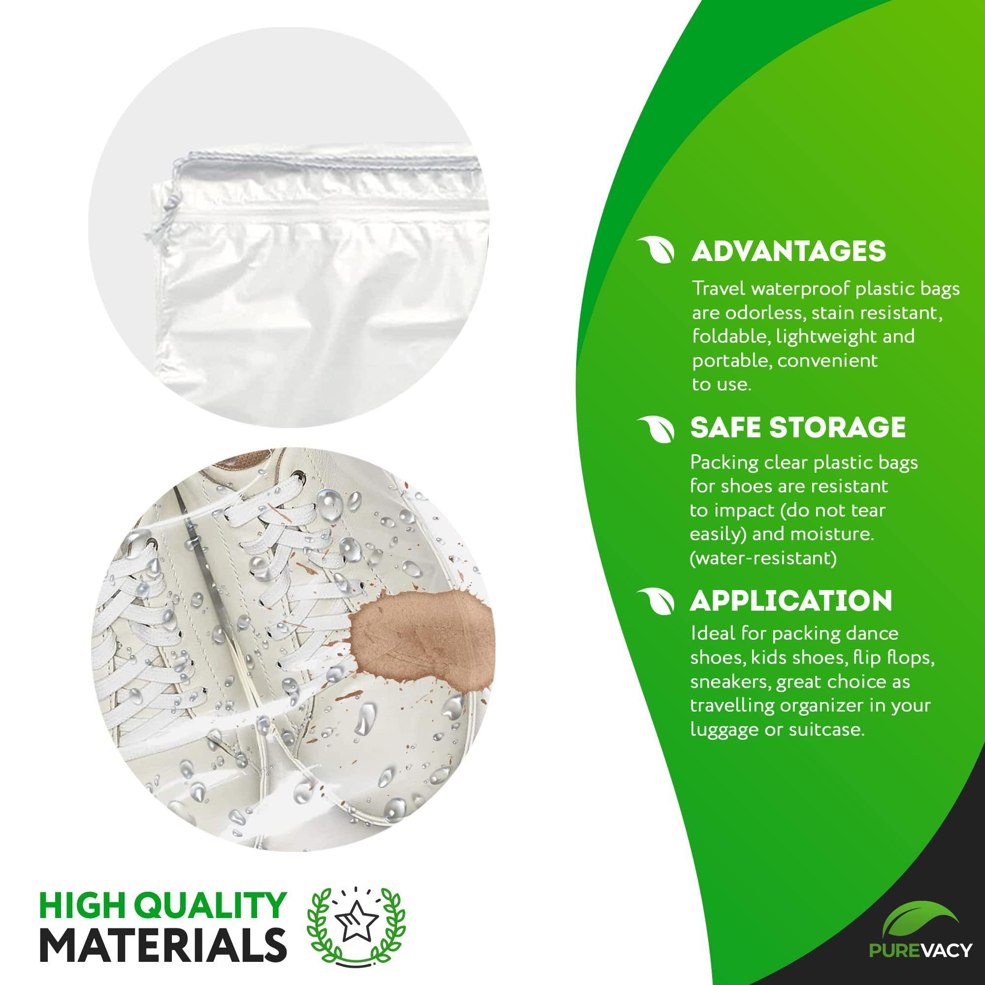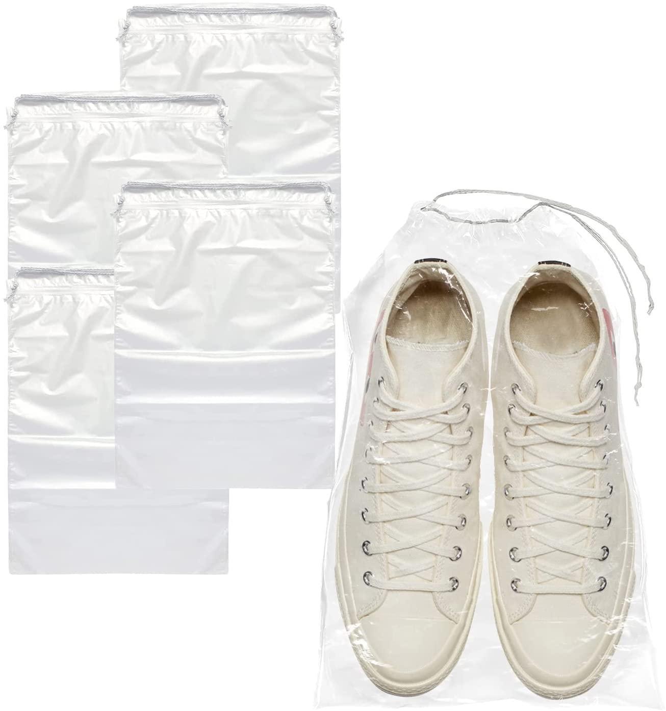 Universal Clear Plastic Shoe Bags. Clear plastic drawstring bag is suitable for packing dance shoes, kids shoes, flip-flops, sneakers, boots, etc. Travel plastic clear shoe bags for storage are also excellent organizers for cosmetics, accessories, sports equipment, and underwear.
