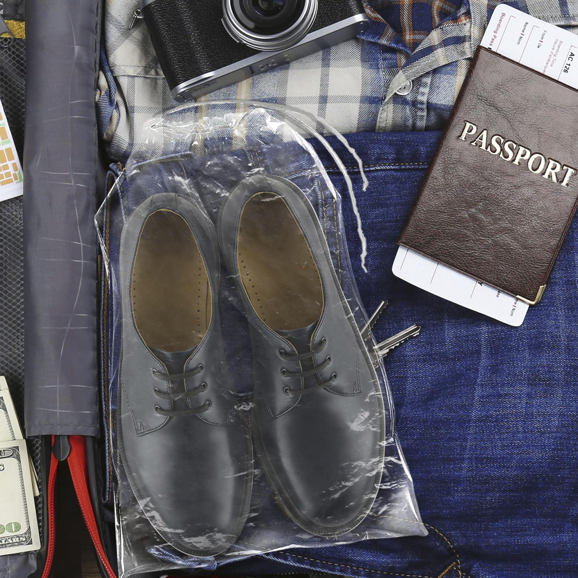 Pack of 100 Drawstring Shoe Bags for Travel 12 x 16.5 INCH: Clear plastic drawstring bags are great for traveling, carrying, storing shoes, or keeping your sneakers dust-free in the closet inside clear shoe bags for storage in closet. Pack with clear plastic bags with drawstrings.
