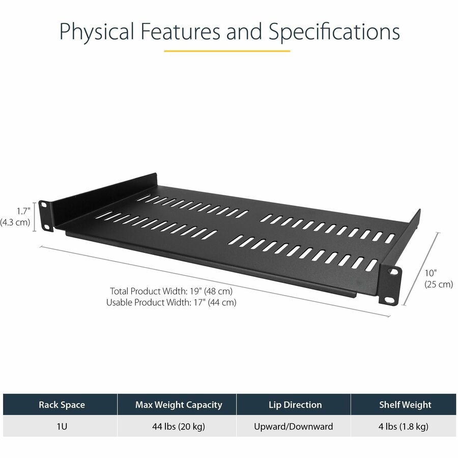 This 1U rack shelf lets you add 10 in. of flat storage space to any EIA-310 compliantserver rack or cabinet. The shelf is vented to improve air flow and help lower temperatures in your rack.