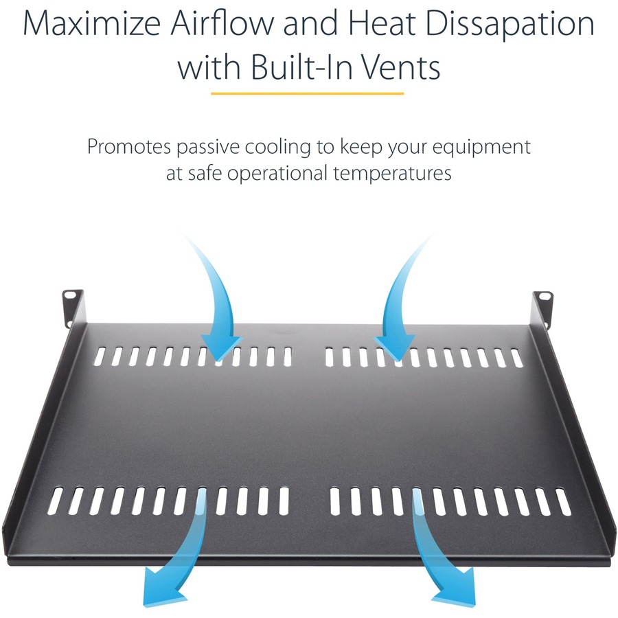 This 1U rack shelf lets you add 7in. (17.5 cm) of flat storage space to any EIA-310 compliantserver rack or cabinet. The shelf is vented to improve air flow and help lower temperatures in your rack.