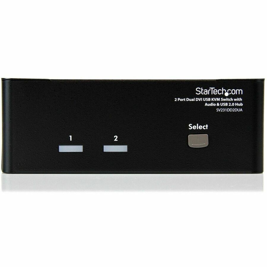 The SV231DD2DUA 2-port Dual DVI USB KVM Switch allows two PCs, each with dual DVI video outputs, to share two monitors, one microphone and set of speakers, one keyboard and one mouse as well as two other USB peripherals.