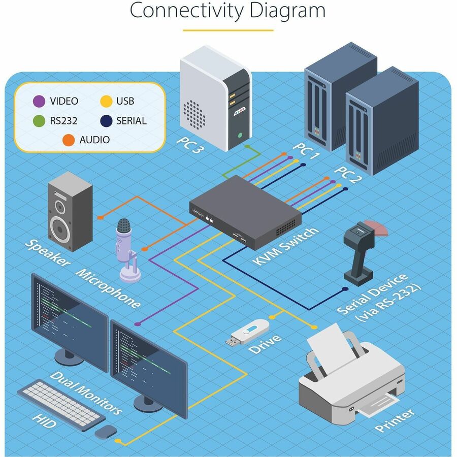 - CUSTOMIZABLE SWITCHING: Universal KVM features push-button and hotkey switching; Independent switching of Video, RS-232, and Audio; Listen to audio from one computer while controlling the other, or switch without interrupting RS-232 Serial communication