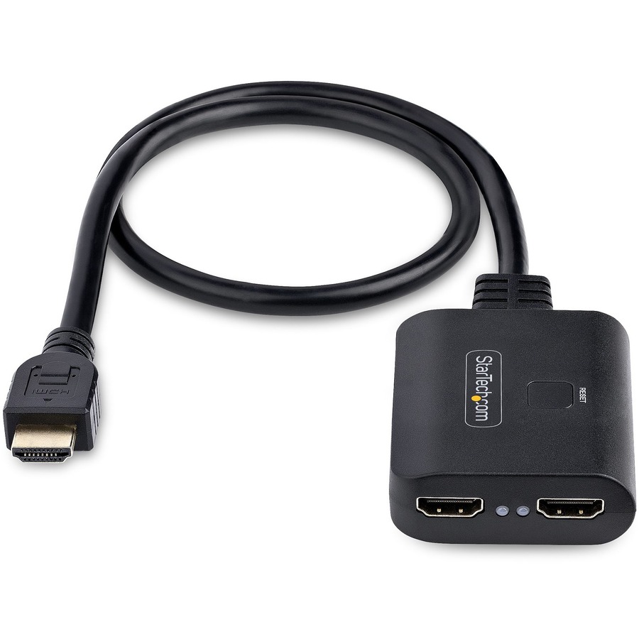 This 2-port HDMI splitter displays the same image from an HDMI video source onto two HDMI displays, with support for UHD 4K resolutions, HDR (High Dynamic Range), HDCP content, and 7.1 channel audio.