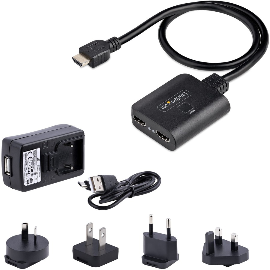 The splitter includes a 31inch (78cm) USB Micro-B to Type-A power cable and USB wall charger. If an outlet is not available or within reach, the USB power cable can be connected to a 5V 1A USB Type-A port.