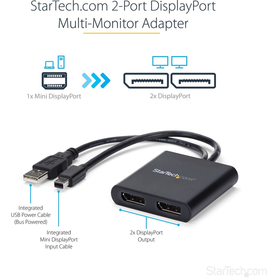 This MST hub lets you connect two DisplayPort monitors to your Mini DisplayPort computer. MST works on any Windows® device that supports DisplayPort 1.2, such as models of the Lenovo™ Think Pad® and Microsoft® Surface™. When connected to earlier revisions of DisplayPort, such as DP 1.1 the MST hub acts as a video splitter.The MST hub is USB powered, so the only thing you’ll need to operate the hub is your computer.