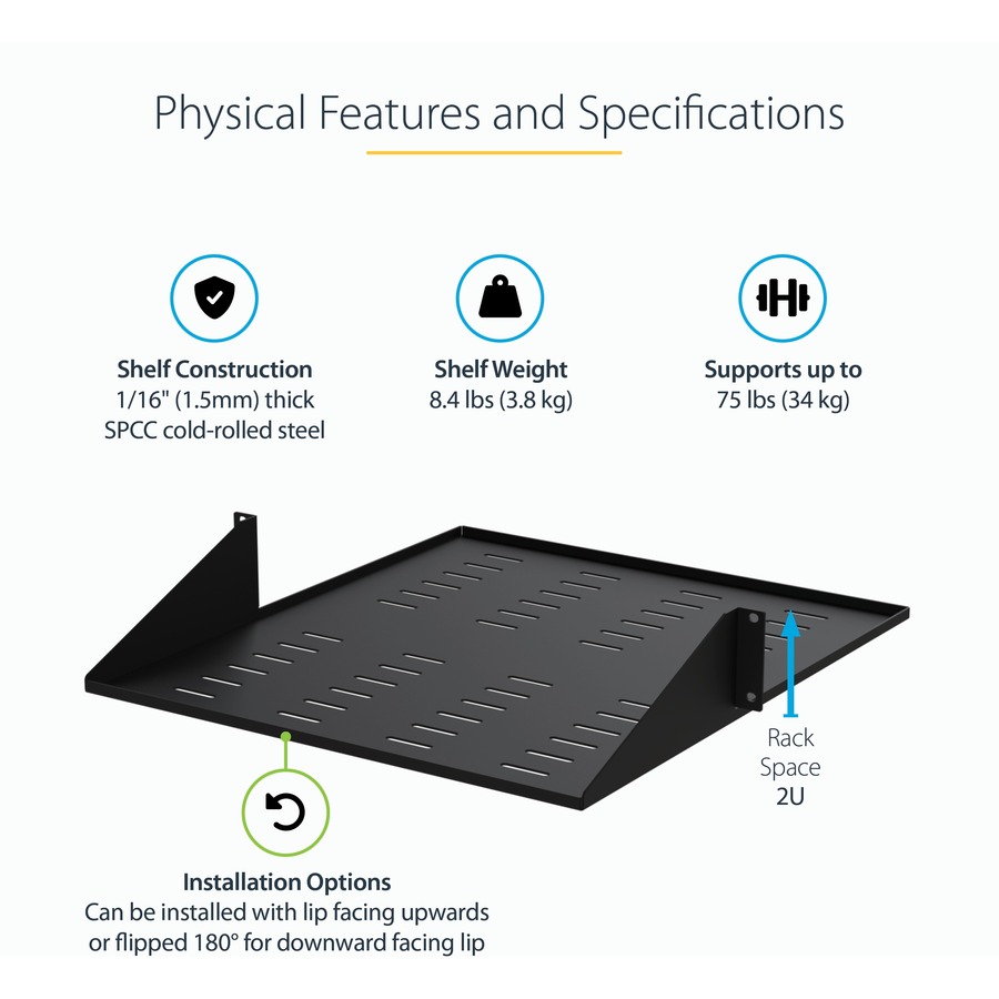 Constructed using SPCC commercial grade cold-rolled steel, this durable 2 post network rack shelf can hold up to 75 lb. (34 kg) of equipment – a perfect solution for storing non-rackmount equipment, tools, peripherals or accessories in your rack to keep them readily accessible.