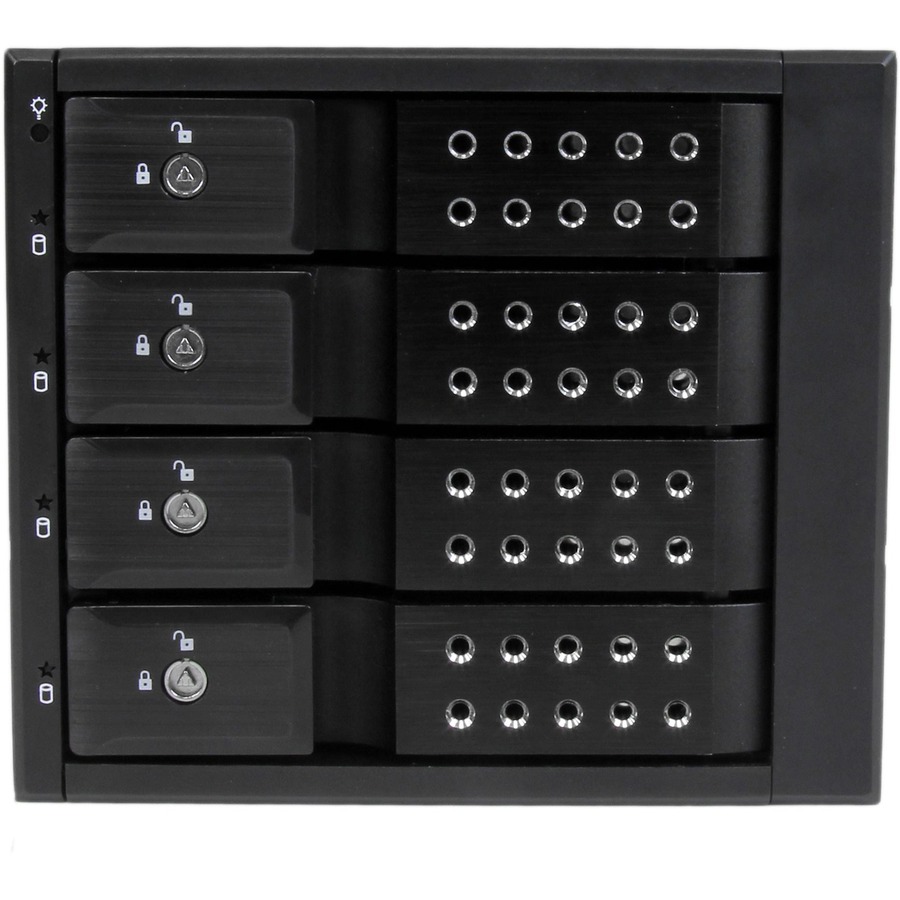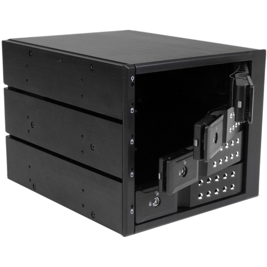 For a quick and secure method of installing and removing drives, the backplane features ejection levers and a key-lock design. To help prevent drive failure, the bay provides drive cooling with a built-in fan and excellent heat dissipation with a vented aluminum enclosure.