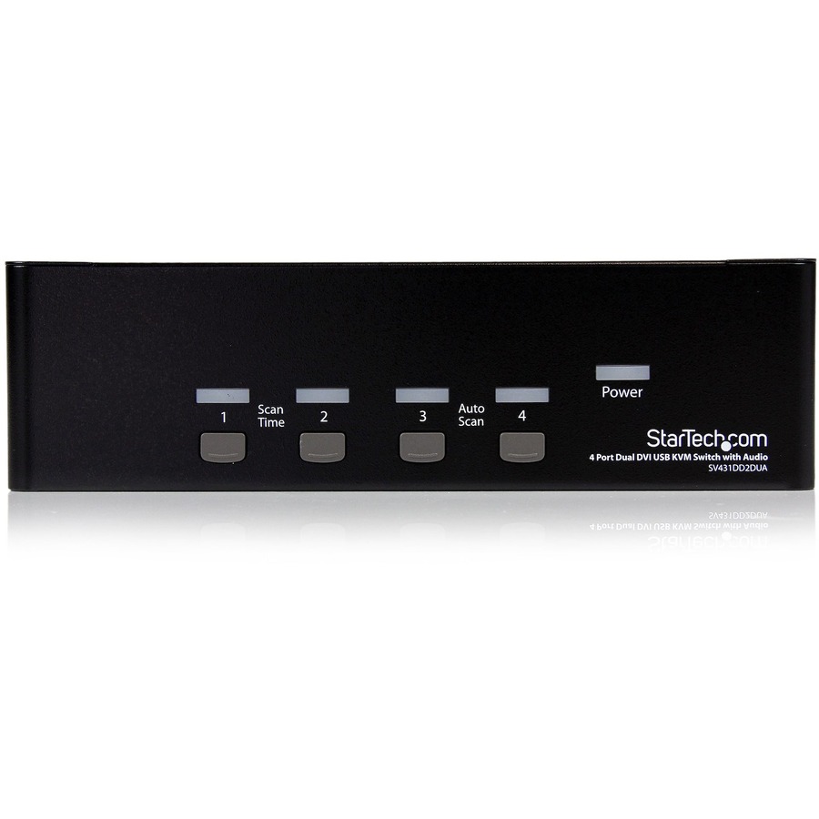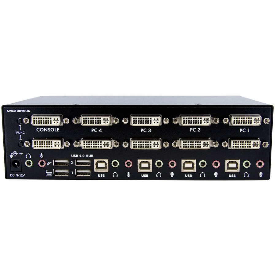 The SV431DD2DUA 4-port Dual DVI USB KVM Switch allows up to four PCs, each with dual DVI video outputs, to share two monitors, one microphone and set of speakers, one keyboard and one mouse as well as two other USB peripherals.