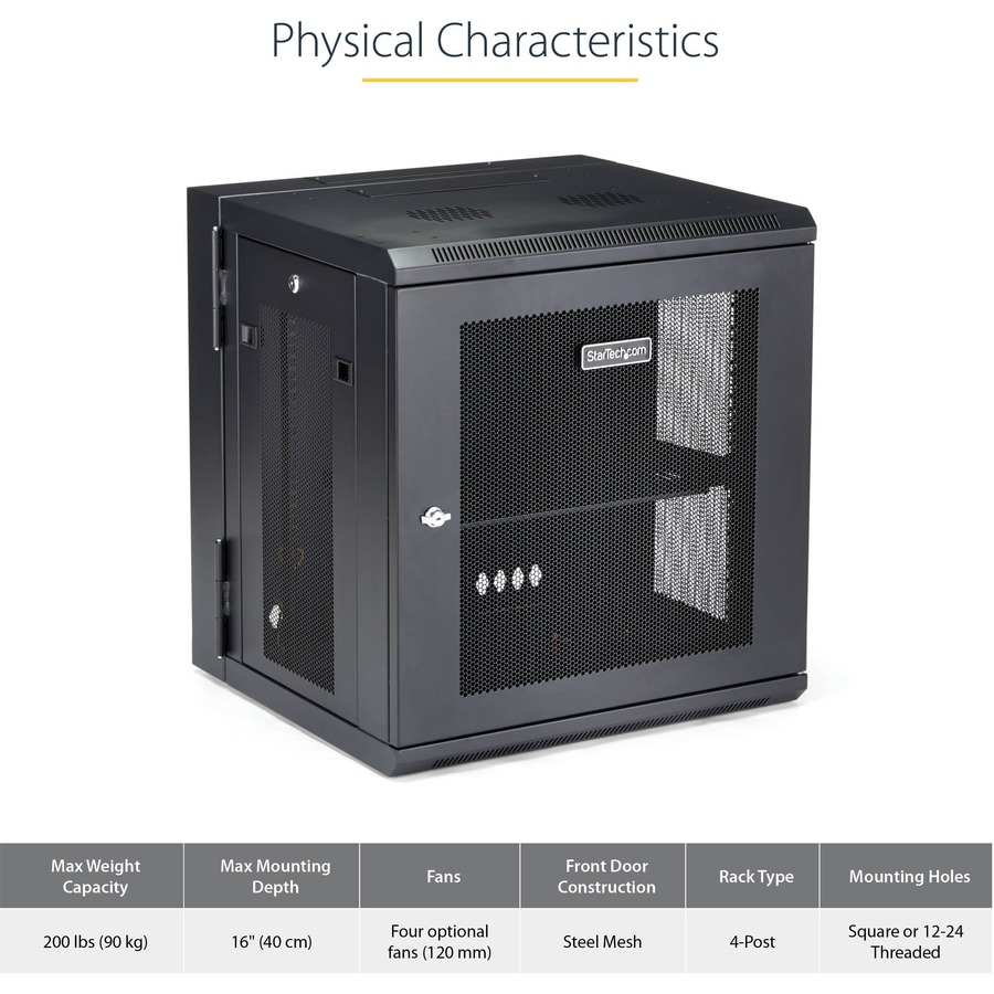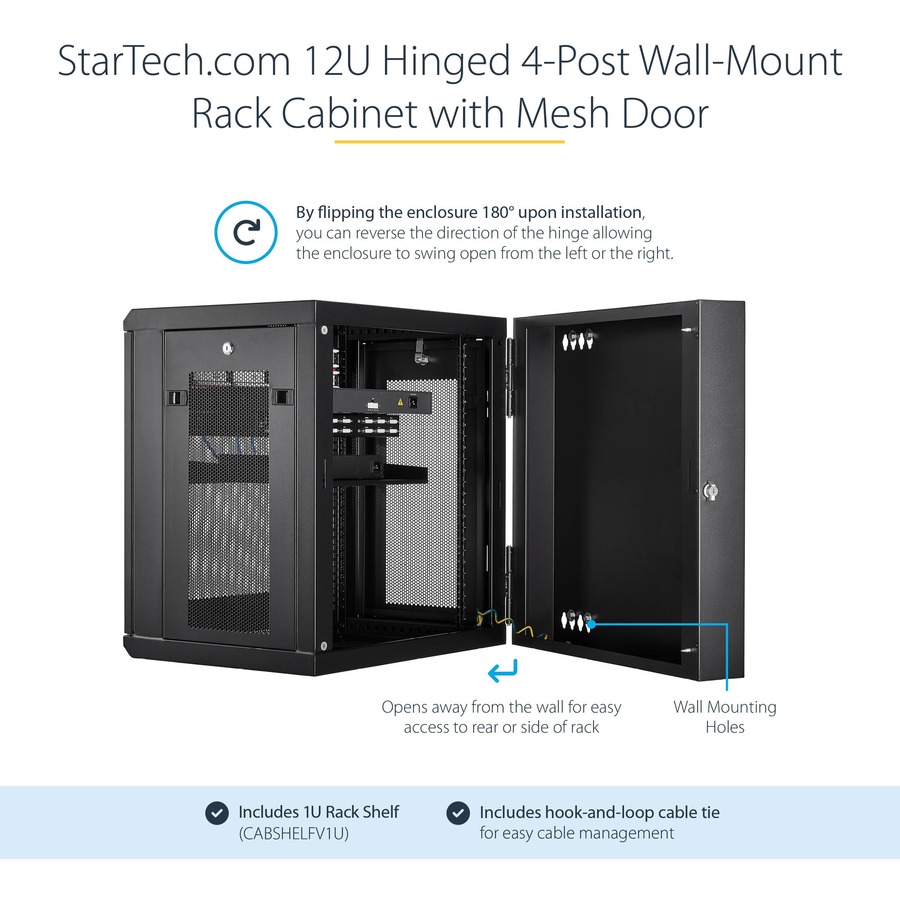 - EASY ACCESS: Wall-mount data rack features a 180° hinged, enclosed and lockable rack design with easy access to the rear of the mounted devices; Flexible locking server cabinet with reversible and removable front door and removable side panels