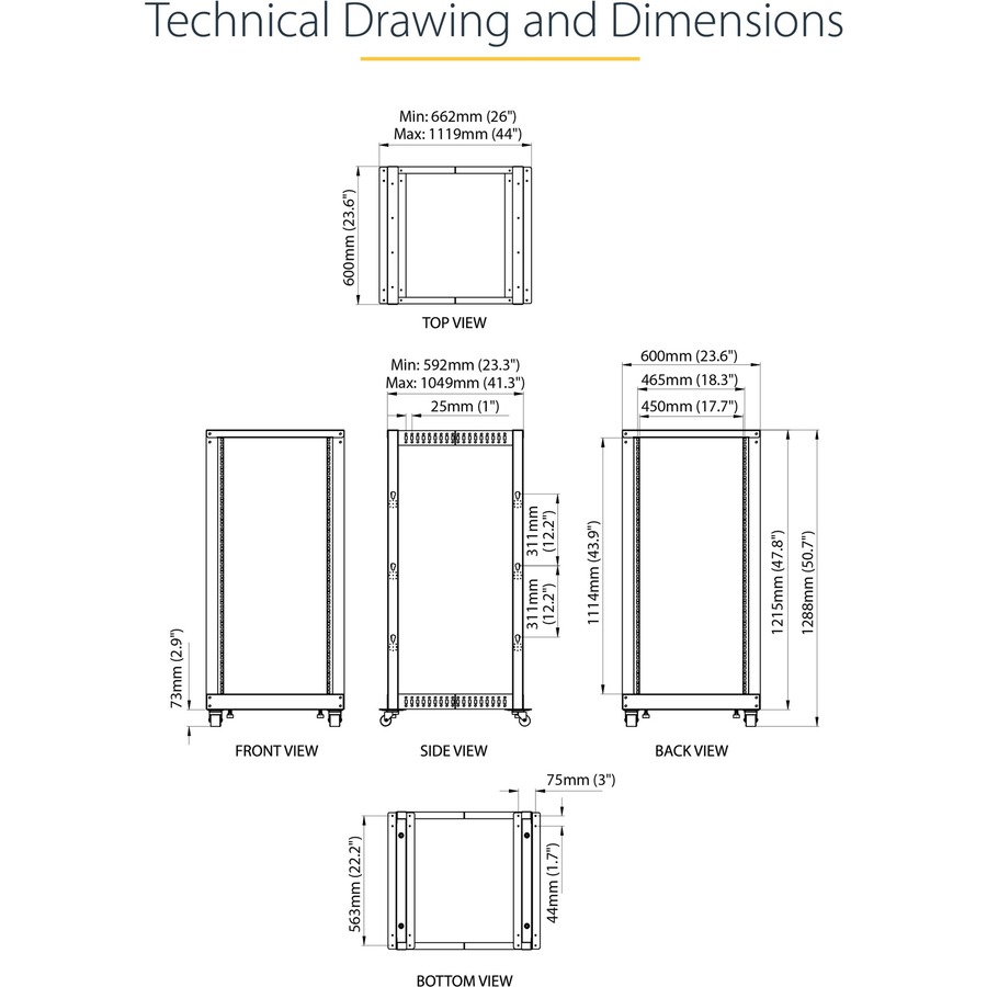 Designed with ease of use in mind, this 25U rack offers easy-to-read markings for both rack units (U) and depth, with a wide range of mounting depth adjustments (22 – 40in) that make it easy to adapt the rack to fit your equipment.