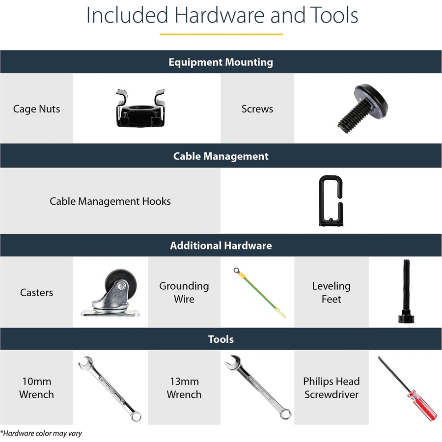 - HARDWARE INCLUDED: Rolling computer/data rack includes cage nuts and screws to mount equipment, easy to read Units (U) and depth adjustment markings, cable management hooks for organization, and required assembly tools