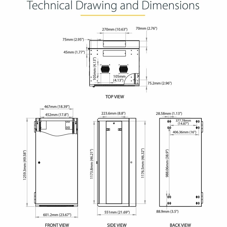 This 26U server or network rack cabinet lets you mount your EIA-310 compliant equipment to the wall, in a secure enclosure that has a hinged rear door for easy access to your equipment. The enclosure features adjustable mounting depth from 3 to 20 in. to provide a robust storage solution for your rack-mount equipment.