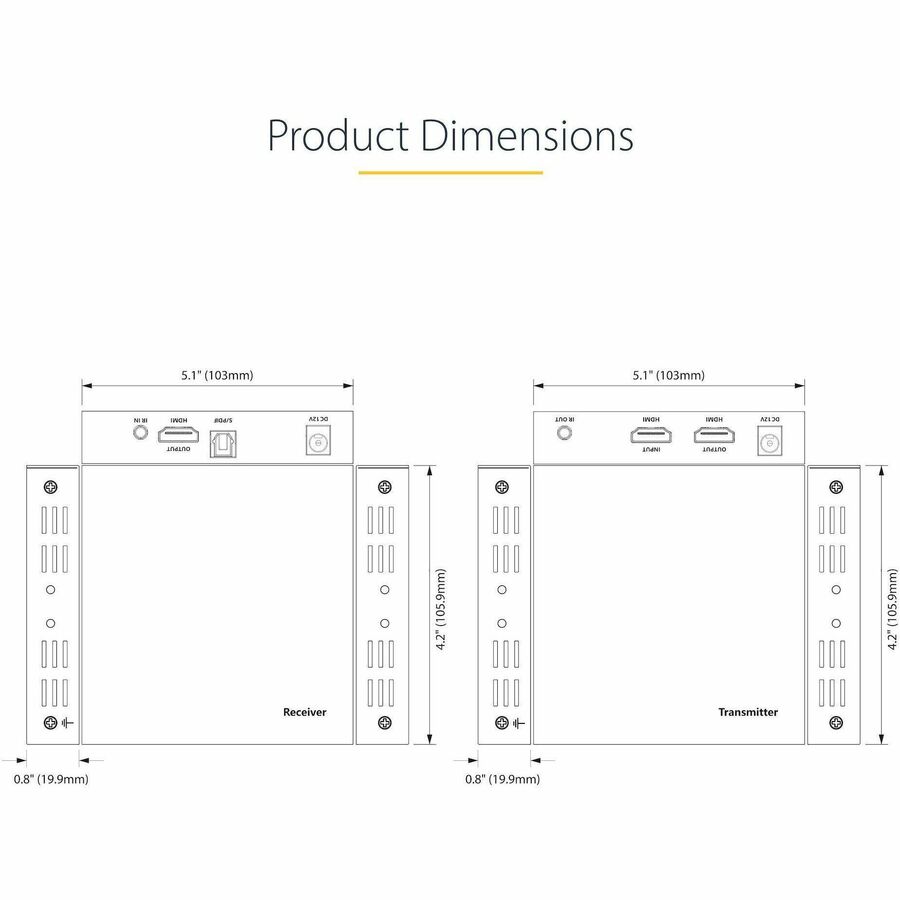 The 4K HDMI Extender features an HDMI output on the transmitter unit, enabling the connection of an HDMI display or to connect additional video extenders – to establish a cascade connection. Plug-and-play installation with no additional software or drivers required. Attach the mounting brackets to the metal housing and to a wall, ceiling, or to the underside of a table, facilitating a multitude of professional installation options. The rubber feet protect the mounting surface and isolate the units from vibration.