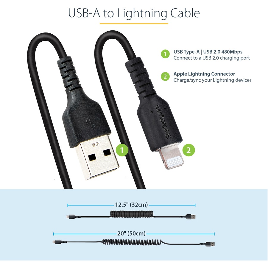 This coiled Lightning to USB A cable can withstand the daily demands of charging and syncing your mobile devices. It contracts to 1ft (32cm) making it compact and convenient to store.