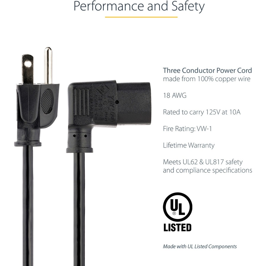 This 6ft Right Angle Power Cord features a standard NEMA 5-15P connector as well as a right-angled C13 connector allowing you to plug a monitor, PC, or laser printer into a grounded power outlet.