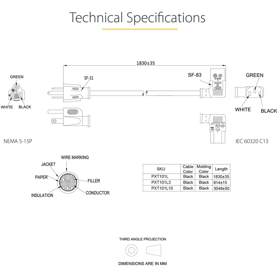 The right angle C13 connector positions the shaft of the cable flush with the back of the device you are connecting, saving space at the connection point. Backed by Lifetime Warranty.