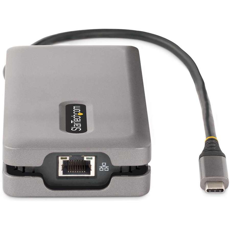 The Multiport Adapter features an extra-long attached 12.6in. (32cm) USB-C host cable. The Thermoplastic Elastomer (TPE) cable jacket is softer and more flexible than PVC jacketed cables. The extra-long cable reduces port/connector strain, particularly when laptops are placed on riser stands, or on 2-in-1 devices with raised USB-C ports, such as the Microsoft Surface. In addition, the Multiport Adapter also features an innovative wrap-around cable manager that facilitates tangle-free storage in a laptop bag.