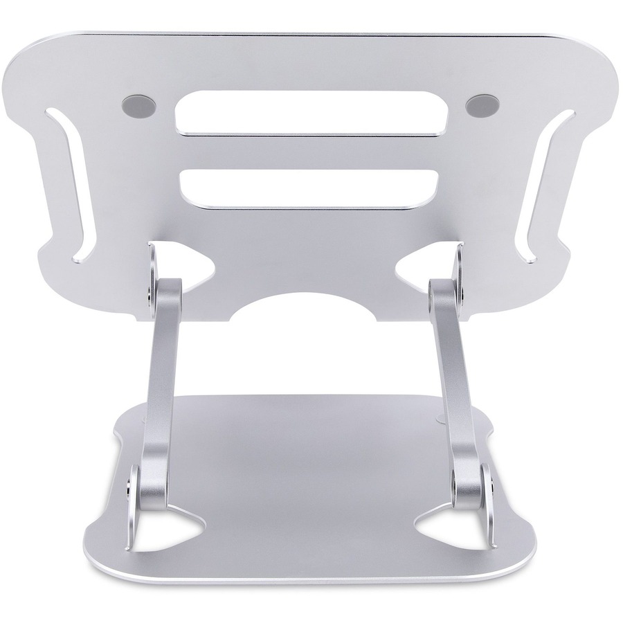 The laptop riser features a silver anodized finish with aluminum construction to ensure durability and sturdiness. The vented surface area is elevated to promote passive cooling and airflow. The space underneath the laptop platform can be used to store a keyboard, mouse, and/or other accessories and peripherals when they are not in use.