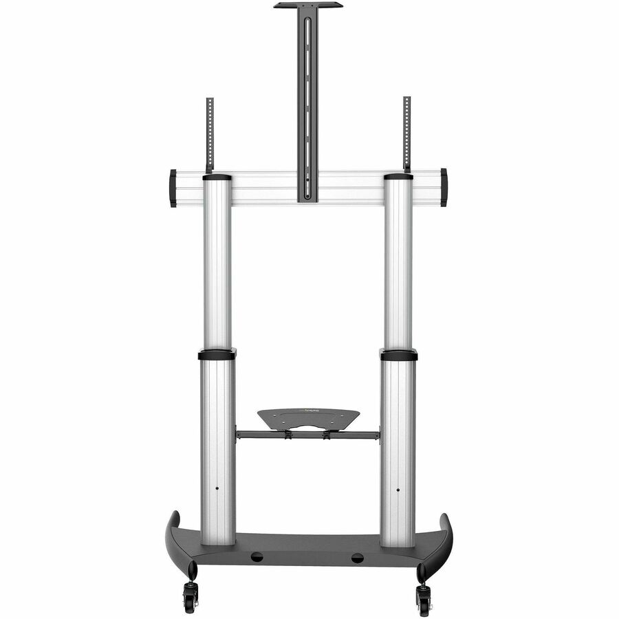 - PORTABLE TV CART: Heavy duty aluminum mobile TV stand on wheels for 60-100 inch displays and up to 220lb (100kg); 4 lockable casters; Easily moved with handles attached to columns; Sturdy steel base to prevent tipping hazard (48″x27.9″/1220mmx710mm)