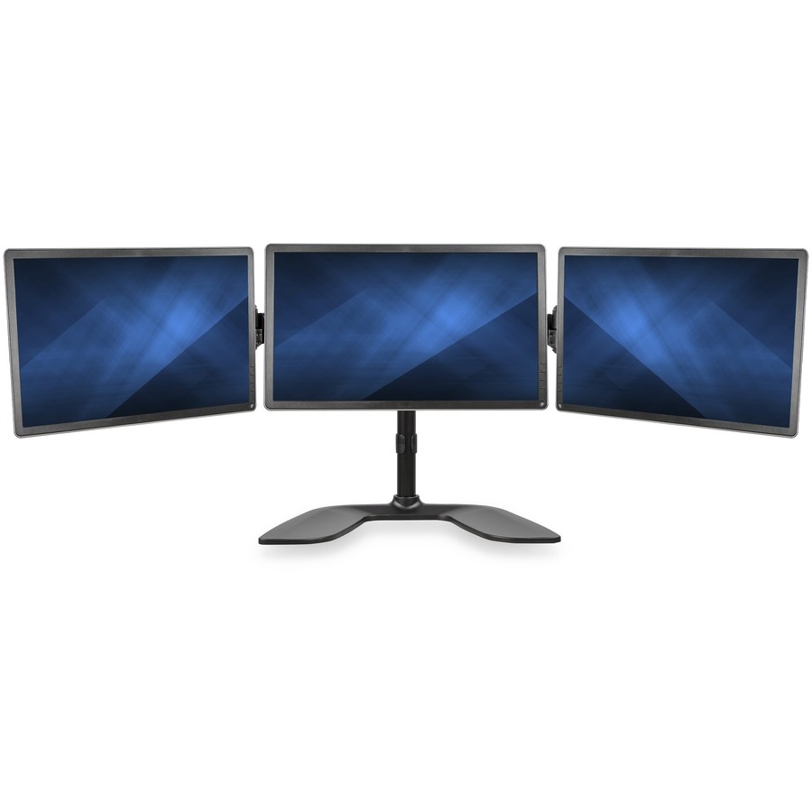 This free-standing triple-monitor stand saves you valuable desk space, while creating a more comfortable and ergonomic workspace. Constructed of high grade steel, the sturdy monitor stand suspends up to three monitors above your desk or other work surface.