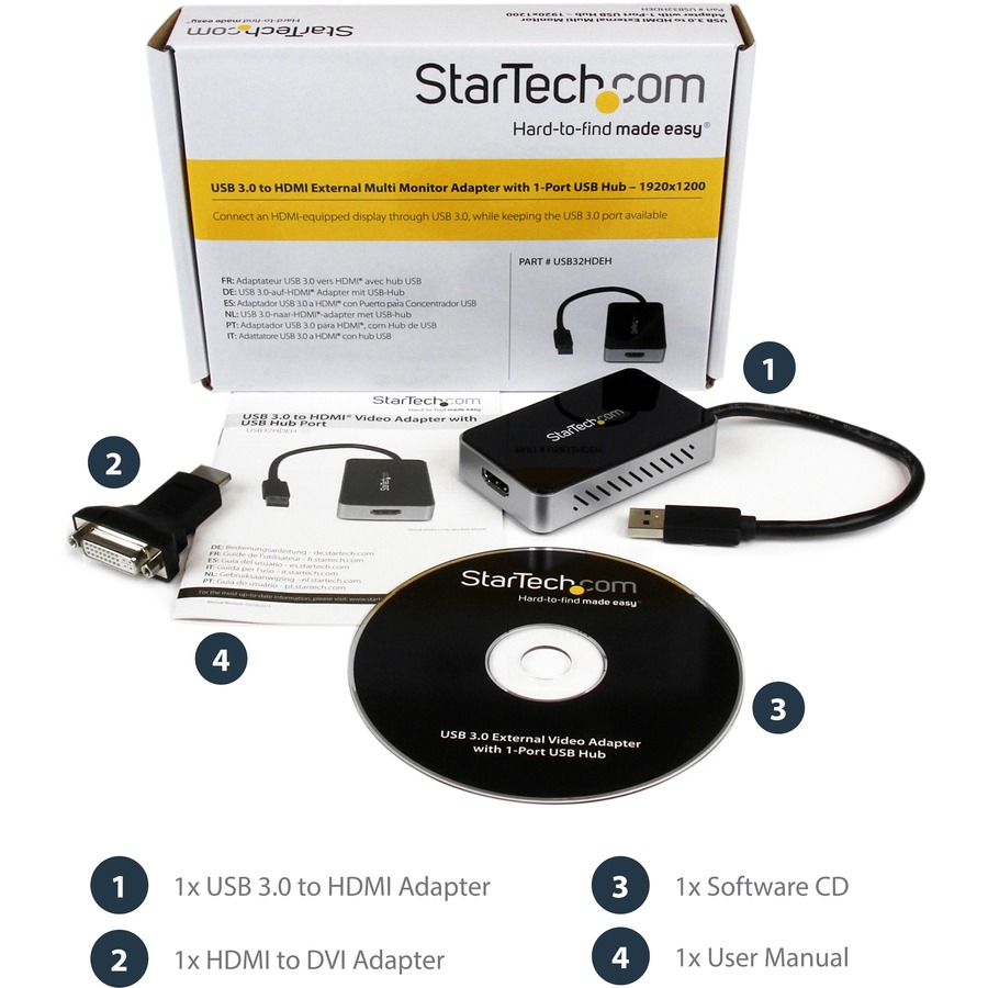 The USB32HDEH USB 3.0 to HDMI® Adapter is TAA compliant and turns a USB 3.0 port into an HDMI output port with 1920×1200/1080p video support. The adapter features built-in USB 3.0 pass-through, which offers a connection port in place of the USB port used for connecting the HDMI adapter – an ideal workaround for Ultrabook™ or laptop users, where only a limited number of USB ports are available.