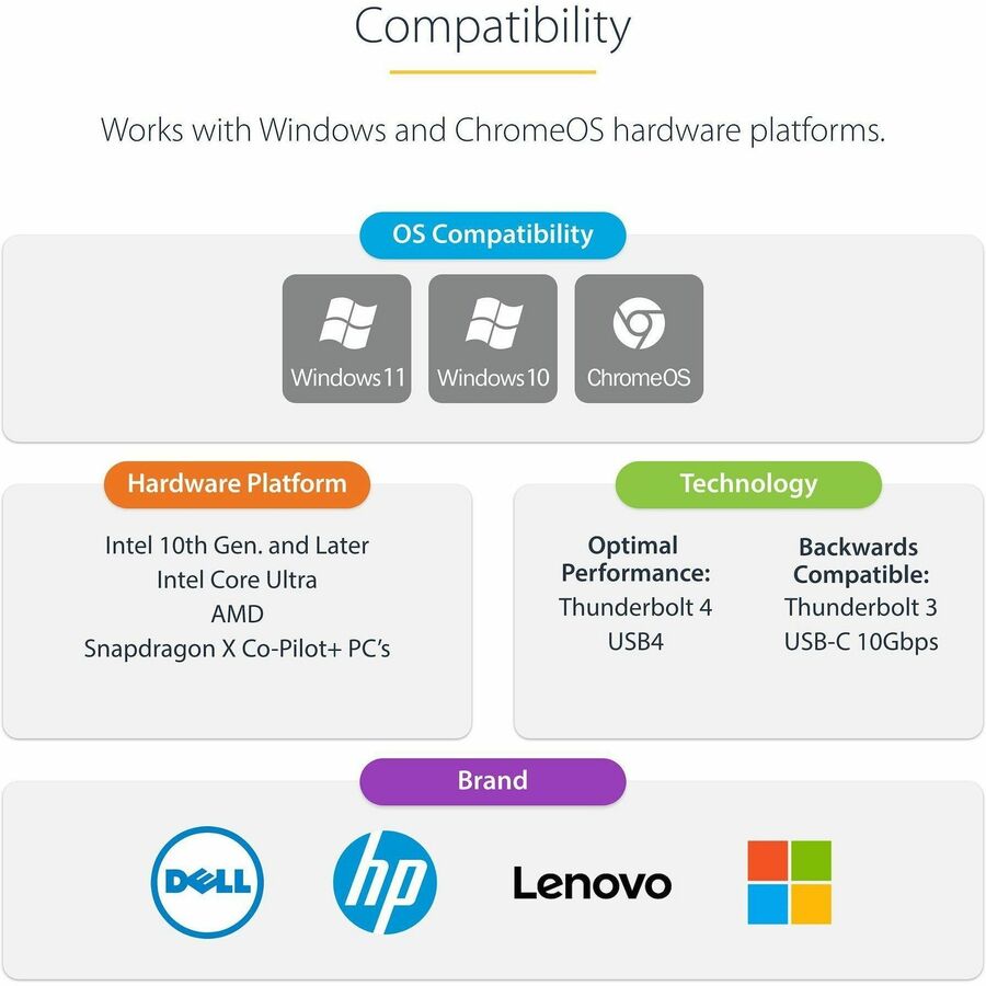 - COMPATIBILITY: Dock is Compatible with Windows 11 (x64 and ARM), Windows 10, and ChromeOS; Optimal performance with Thunderbolt 4 and USB4 laptops; Compatible with Intel 12th Gen and later, Intel Core Ultra, AMD, and Snapdragon X Co-Pilot+ PC’s