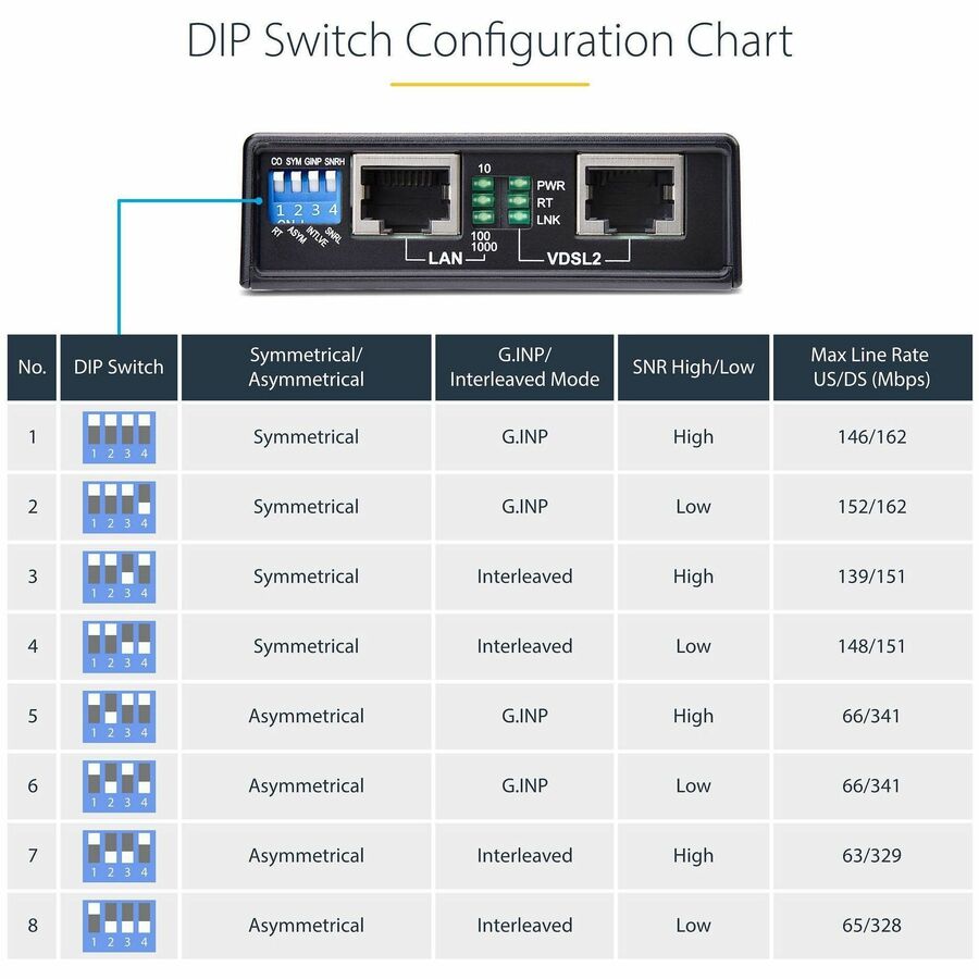 - 8 PROFILE CONFIGURATIONS: Customize the installation with DIP switch selectable settings; Choose between Master or Remote mode, Symmetric or Asymmetric mode, G.INP or Interleave mode, and fine-tune SNR with High and Low options for optimal performance