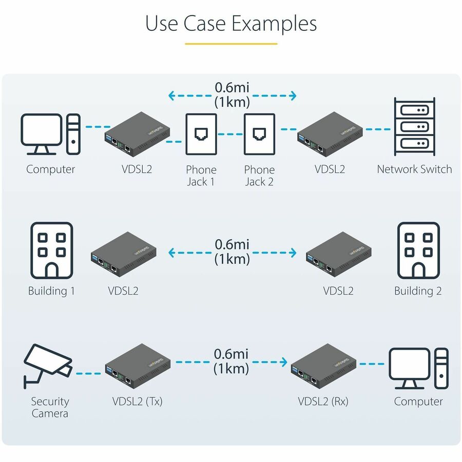 Extend a network over VDSL2, using Cat5e (or better) UTP Cabling or Single-Pair (or better) Telephone Wire at distances up to 0.6mi (1km).
