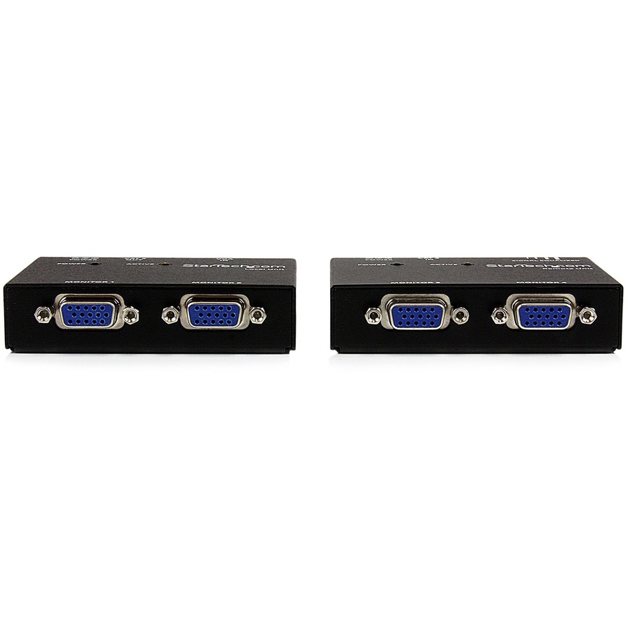 The local unit features a single VGA input as well as two VGA outputs giving you the ability to view and split your source VGA signal to two independent displays locally. The VGA video signal is then sent over standard 4 pair Category 5 or better UTP cable to the remote unit which also features two additional VGA outputs giving you the freedom to display your VGA source on up to four monitors in total.