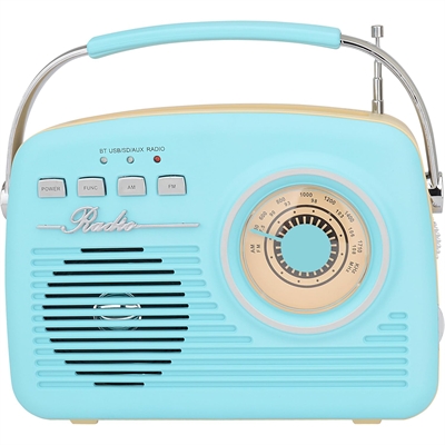 Retro Portable Bluetooth Speaker with AM FM Radio Bluethooth 5.2 USB SD Card AUX Inputs AM FM Radio Headphone Jack: 3.5mm Stereo Battery: 3.7V 1200mAH Play Time: Up to 5 Hrs. Charging Time: Approx. 2 Hrs. Power Consumption: 8W Output Power: 1.8W Telescopic Antenna Frequency Range:AM: 53017 10KHz FM: 87.5 108MHz Supported Audio Format: MP3 Power Supply:DC 5V, 1A not included 60cm 23.6 in. USB Charging Cable included