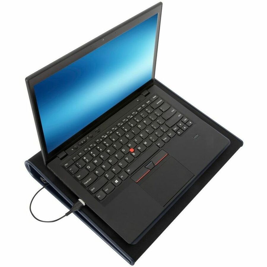 This chill pad for a laptop is effective and so easy to use. Simply plug the USB connector into the laptop to activate cooling. The ergonomic tilt makes typing easy, while the soft neoprene material provides cushioned comfort on your lap. The open design allows fans to run quietly and stimulates constant airflow.