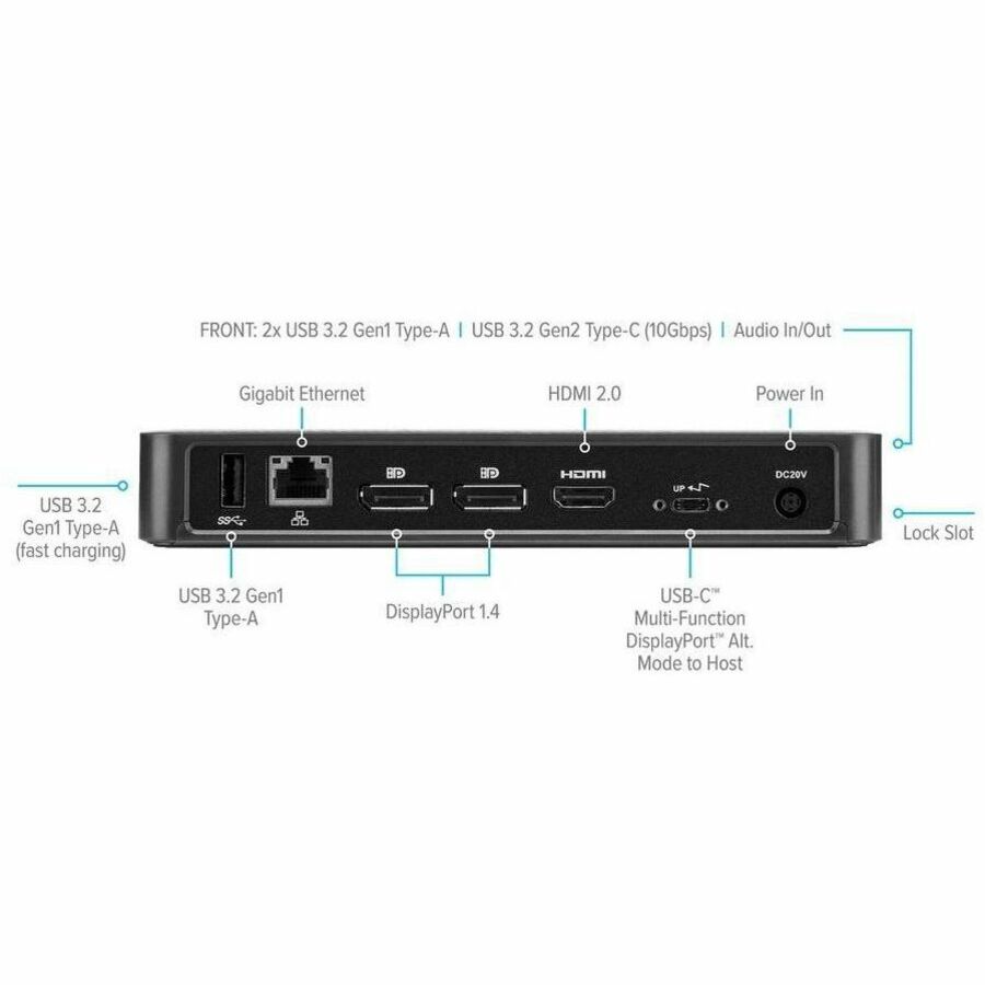 Enjoy crisp, clear native video while supporting a connection up to three monitors. With two DisplayPort™ 1.4 ports and one HDMI 2.0 port, you’re able to support three monitors (1920×1080 p60), two monitors (2560×1440 p60) or one monitor (3840×2160 p60) and various lower resolutions. Plus connect all your favorite accessories with a combination of USB-A (4 USB 3.2 Gen1 ports, 1 fast-charging) and USB-C (1x 3.2 Gen2), plus Ethernet and audio ports.