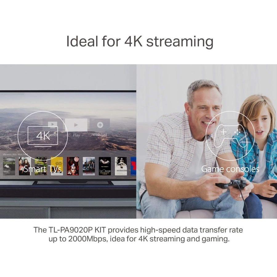 The TL-PA9020P creates fast, high performance wired connections that support all of your favorite devices, like 4K HDTV. Now you can plug in to enjoy an exclusive fast lane out of a crowded network without slowing down.