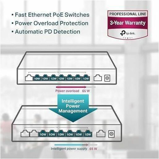 When total power consumption exceeds 65 W, the intelligent power management will cut the lower priority port power. This ensures the high priority port’s power supply and protects the device from power overload. It also automatically detects and provides the required power for your PoE devices while protecting your PoE and non-PoE equipment from being damaged.