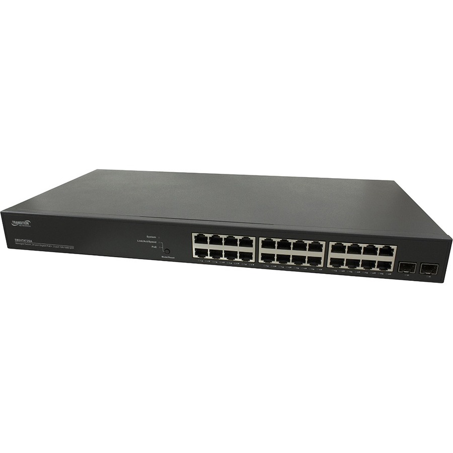 This switch is a next generation smart managed switch with 52Gbps switching capacity. It provides (24) 10/100/1000Base-T copper ports with IEEE 802.3at PoE+ capability and (2) additional 100/1000 dual speed SFP slots. The embedded Device Management System (DMS) provides the benefits of ease of use in the IP surveillance, wireless Access Point and other applications. The DMS capability built into the switches is new from Transition Networks and provides time-saving features enabling security integrators or network administrators to establish and document a baseline deployment, automatically discover and remotely configure attached IP-powered devices (PDs).