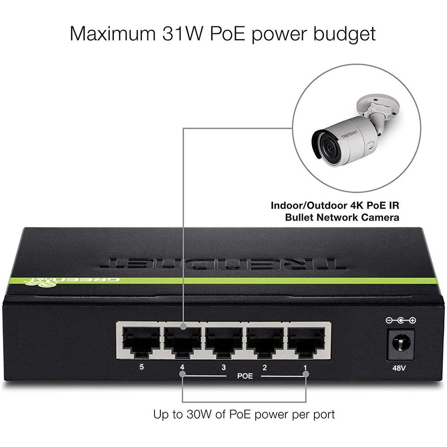 - PoE+ POWER: A 31W PoE power budget supplies up to four Power over Ethernet devices. TPE-TG50g, delivers data and power over existing Ethernet cables to Power over Ethernet (PoE) devices such as access points and IP cameras.