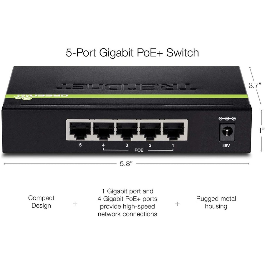 TRENDnet’s 5-Port Gigabit PoE+ Switch, model TPE-TG50g, delivers data and power over existing Ethernet cables to Power over Ethernet (PoE) devices, such as access points and IP cameras. It supports both PoE and PoE+ devices with a 31W PoE power budget. Easily install this compact sturdy metal switch for reliable high-speed PoE networking.