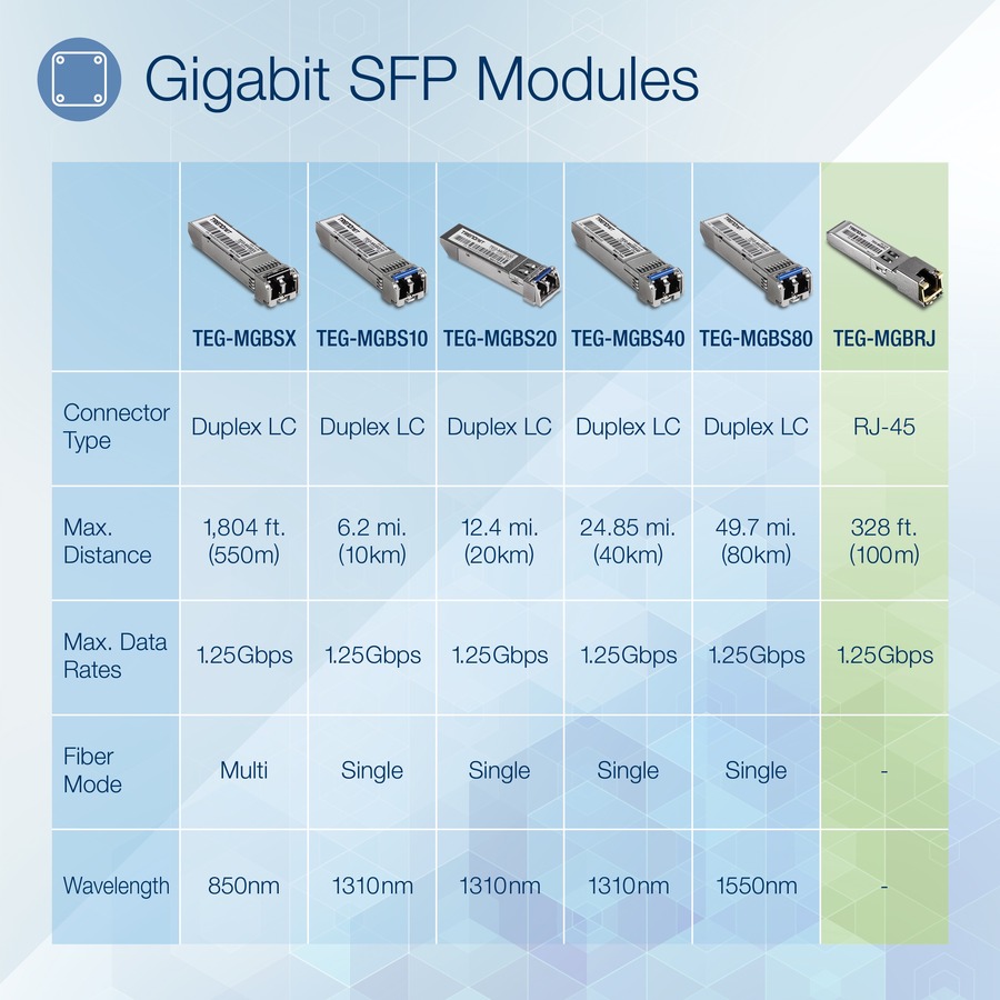 1000BASE-T RJ-45 copper SFP spans distances up to 100m (328 ft.) and supports up to 1.25Gbps.