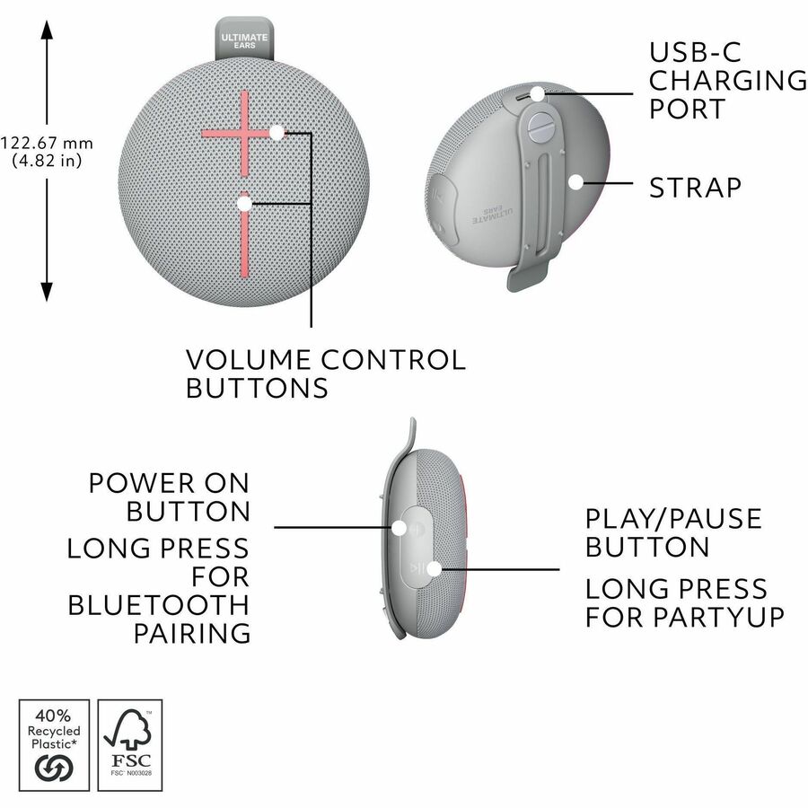- Made With Recycled Plastic: The plastic parts in the MINIROLL mini speaker contain a minimum of 40% post-consumer recycled plastic by weight