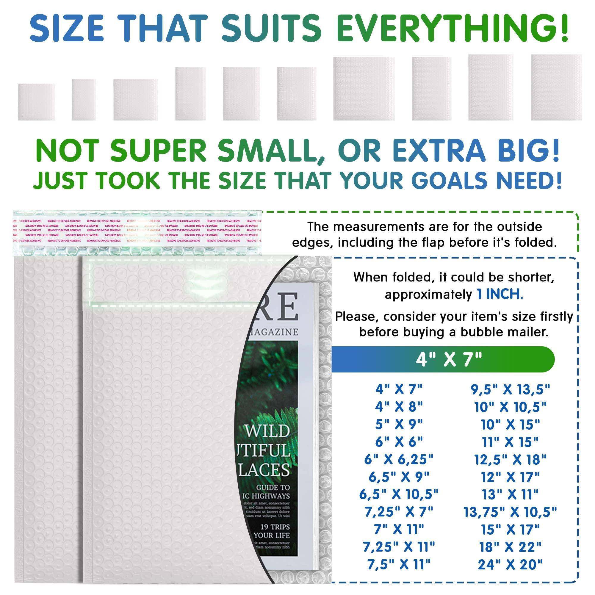 SHIP WITH CONFIDENCE. White waterproof bubble mailers with peel-n-seal are reliable choice for sending private items, photos, documents, etc. Shipping labels and stamps are easily attached to bubble mailer envelopes. Manufacturer size tolerance +/- 0.25″. Size: 4″ x 7″. Quantity: 50 pcs per pack.